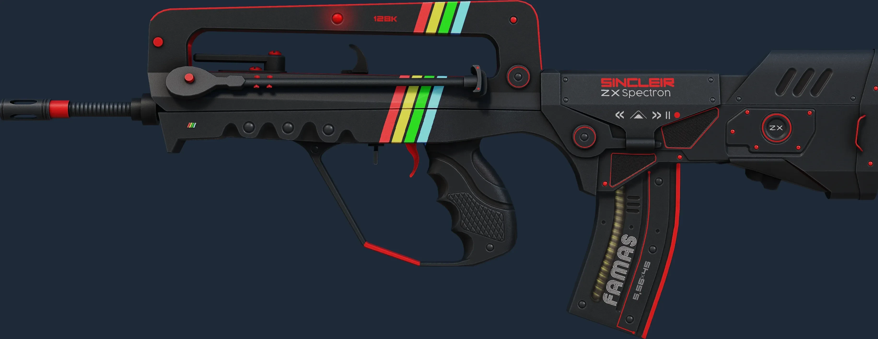 The FAMAS | Zx Spectron is a Covert grade skin for the FAMAS in Counter-Strike 2. It features a Custom Paint Job finish and was designed by S.H.A.D.O.W.