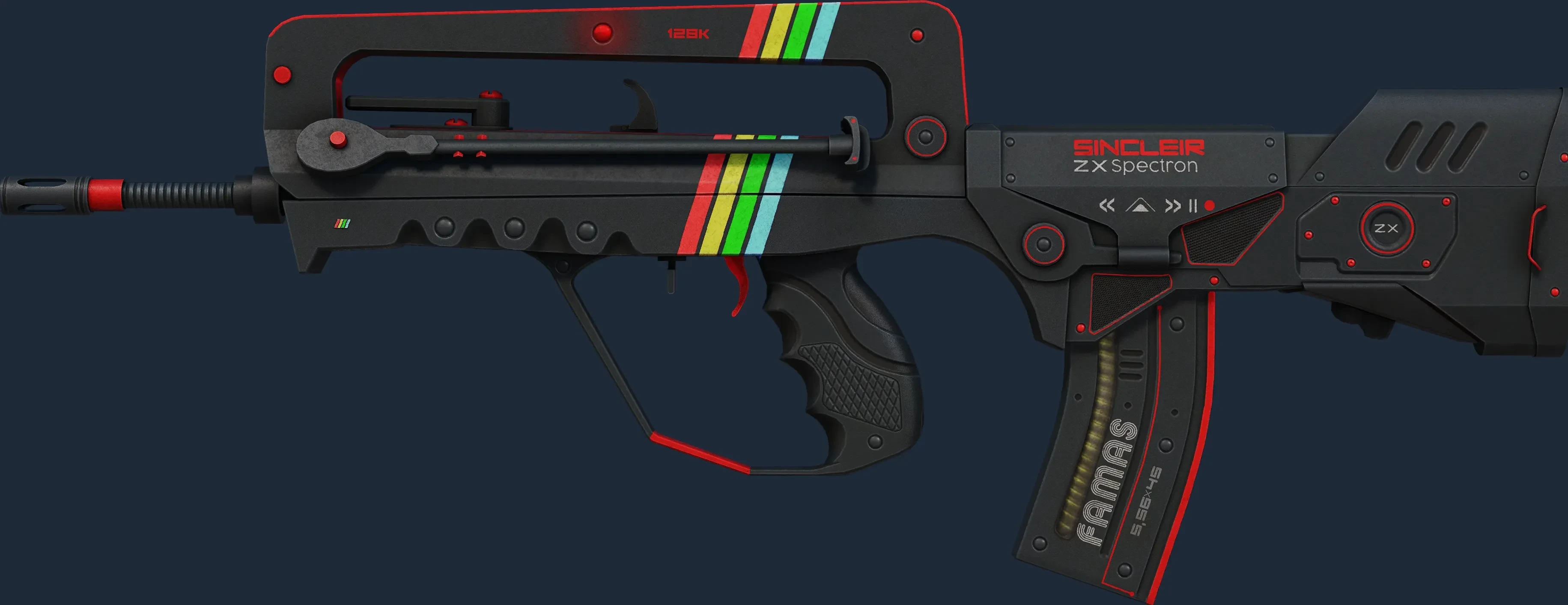 The FAMAS | Zx Spectron is a Covert grade skin for the FAMAS in Counter-Strike 2. It features a Custom Paint Job finish and was designed by S.H.A.D.O.W.