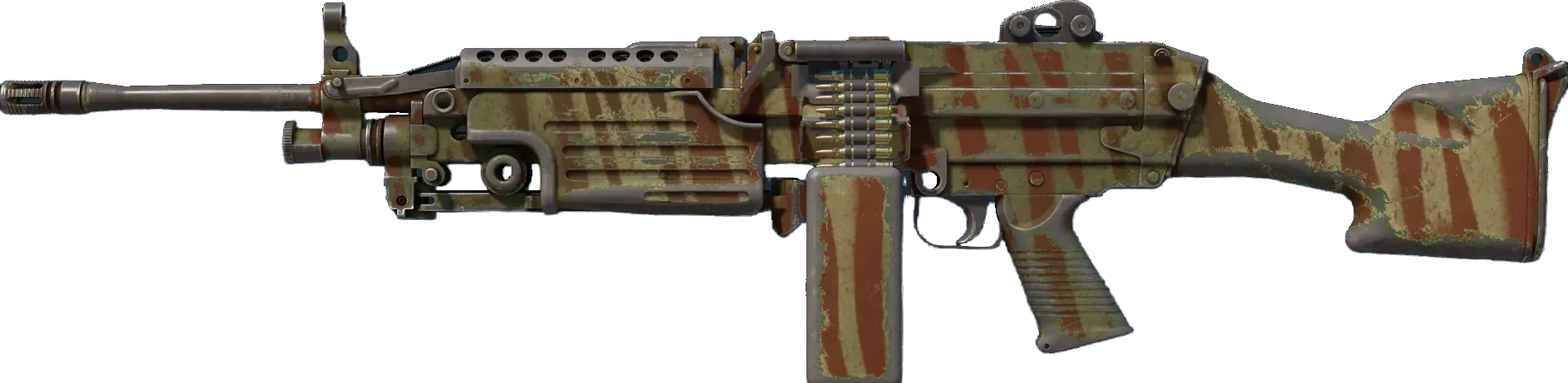 A strong open-area LMG, the M249 is the perfect choice for players willing to trade a slow fire rate for increased accuracy and a high ammo capacity. It has been spray-painted in a zebra stripe pattern.