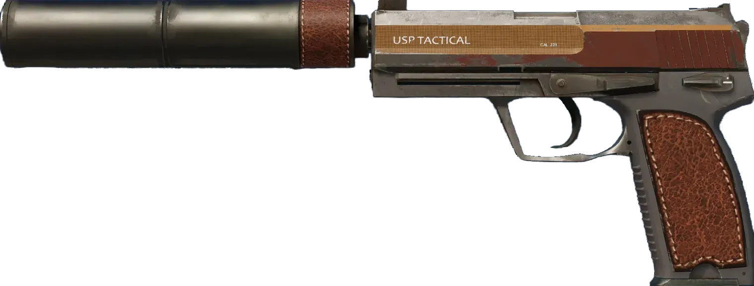 A fan favorite from Counter-Strike Source, the Silenced USP Pistol has a detachable silencer that gives shots less recoil while suppressing attention-getting noise. It has been custom painted with colors and patterns inspired by vintage luggage, and had some parts wrapped in brown leather. _Some people don't just want extra leg room... they want peace and quiet_