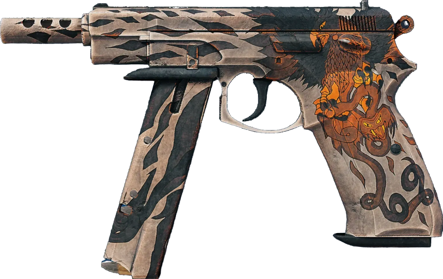 A fully automatic variant of the CZ75, the CZ75-Auto is the ideal short-term choice for turning the tables and gaining your opponents weapon. But with very little ammo in the magazine, strong trigger discipline is required. A bird of prey carrying a snake has been custom painted on this CZ75. _A snake eater, minus the catchy theme song_