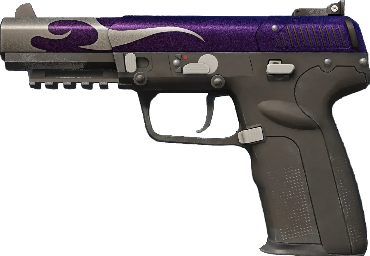 Highly accurate and armor-piercing, the pricy Five-Seven is a slow-loader that compensates with a generous 20-round magazine and forgiving recoil. A silver flame on the muzzle overlays a purple base with a metal flake finish. _Element detected: Cs_
