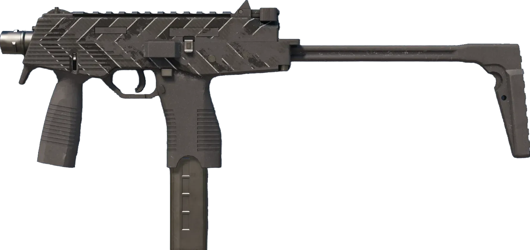 Manufactured in Switzerland, the cutting-edge MP9 SMG is an ergonomic polymer weapon favored by private security firms. It has been painted using a striped hydrographic arranged in a chevron pattern. _Throw enough downfield and you're bound to hit the bullseye eventually_