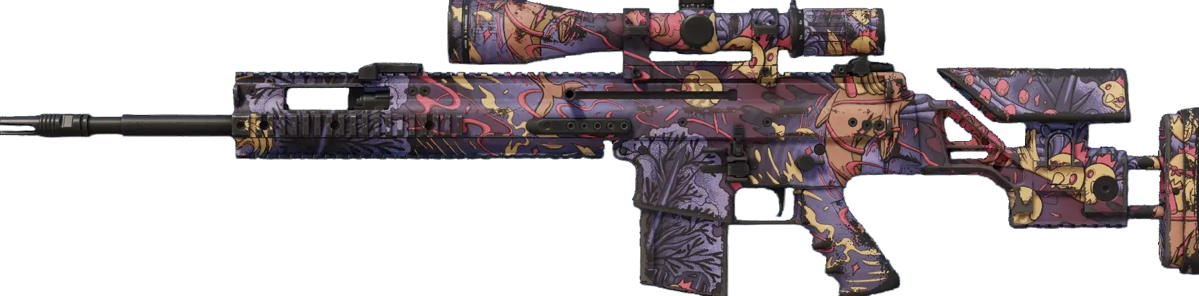 The SCAR-20 is a semi-automatic sniper rifle that trades a high rate of fire and powerful long-distance damage for sluggish movement speed and big price tag. It has been spray-painted with a pattern depicting chickens on a battlefield. _A chicken rides a shark into battle..._