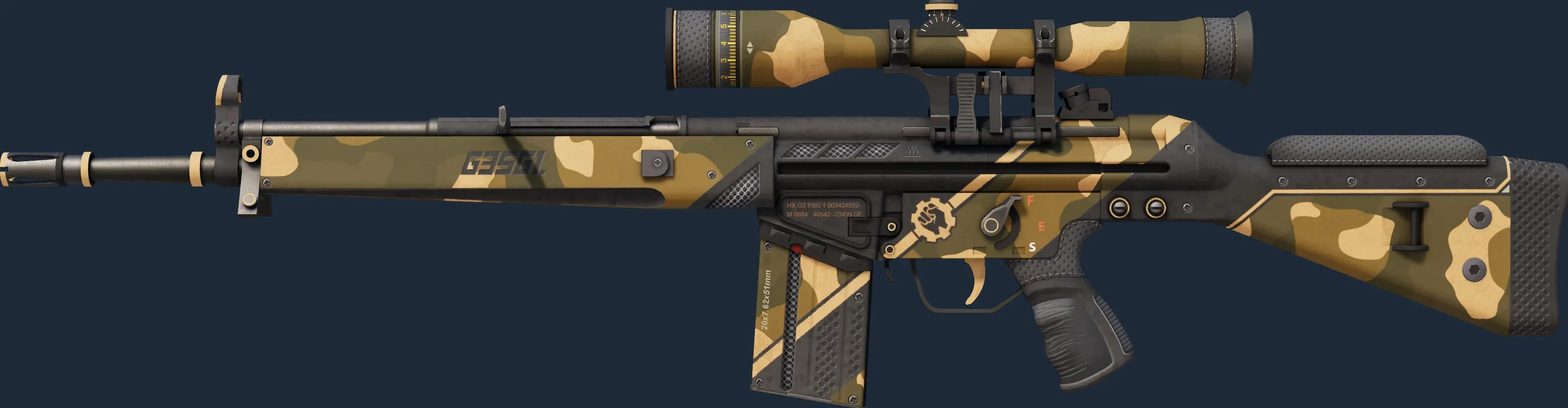 The pricy G3SG1 lowers movement speed considerably but compensates with a higher rate of fire than other sniper rifles. It has been custom painted with a tan and black military camo pattern. _The Coalition Taskforce was winning, so Mikah turned to a more... aggressive approach_