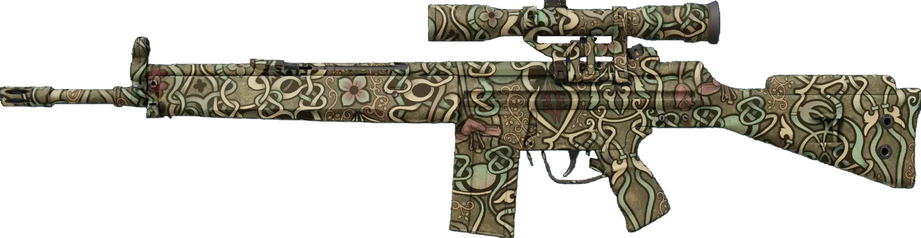 The pricy G3SG1 lowers movement speed considerably but compensates with a higher rate of fire than other sniper rifles. It has been spray-painted with a vine and flower pattern in various shades of green. _Room to grow_
