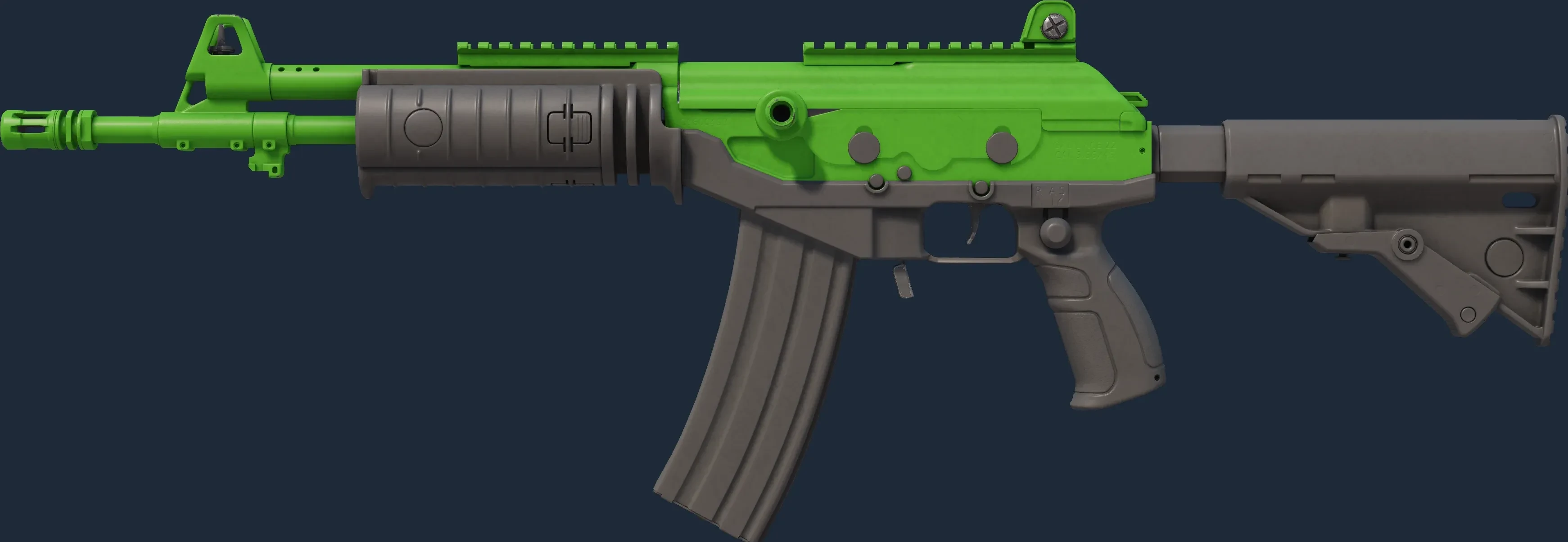 This Galil AR has been painted in a "Solid Color" style, with the Green Apple finish. Individual components of the weapon are painted with up to four unique colors before reassembly. The primary color of this skin is composed of a green tint. Different pattern indexes have no effect on the Green Apple finish. The skin uses the new CS2 model.