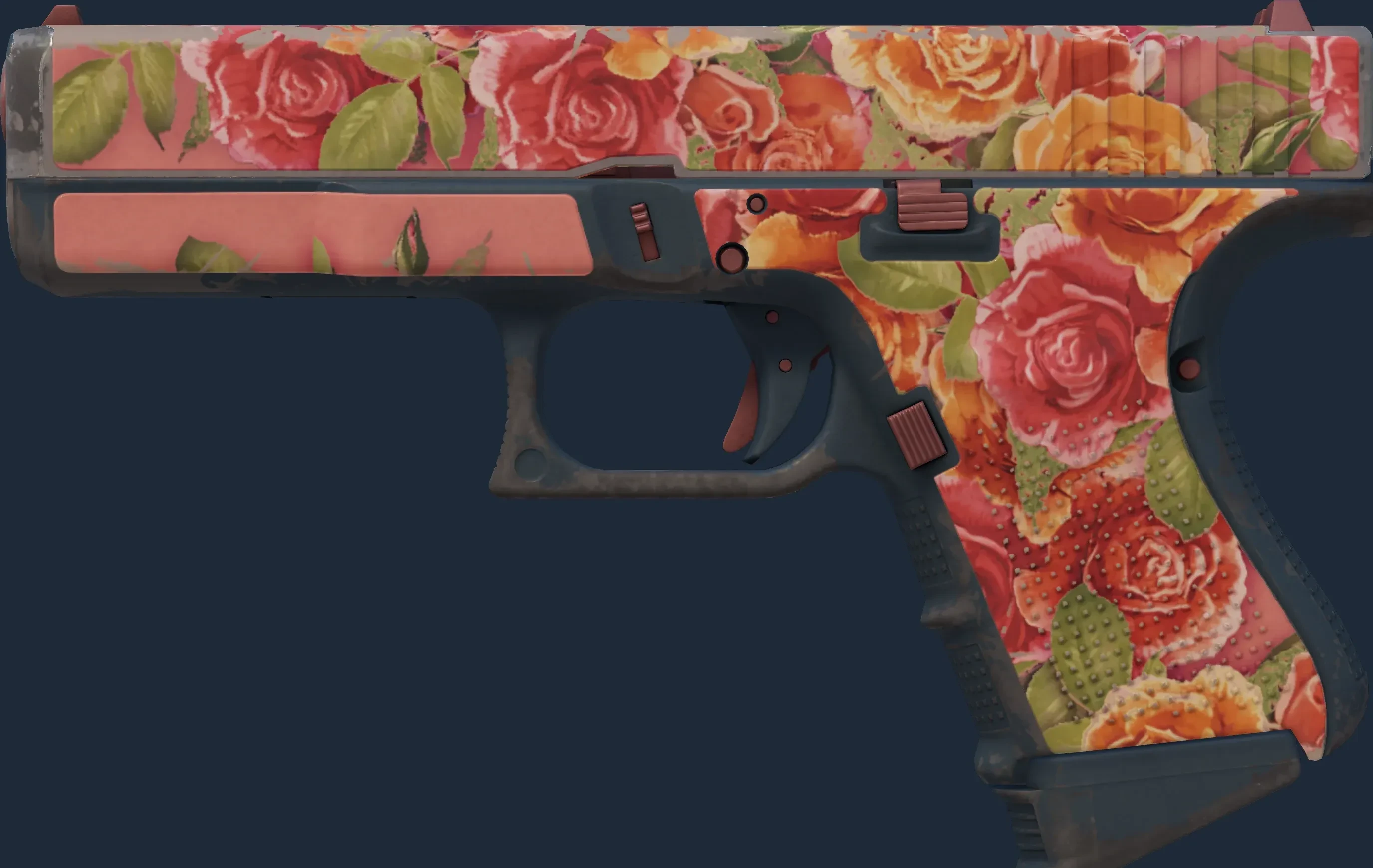 The Glock-18 | Coral Bloom is a Covert grade skin for the Glock-18 in Counter-Strike 2. It features a Custom Paint Job finish and was designed by Valve.