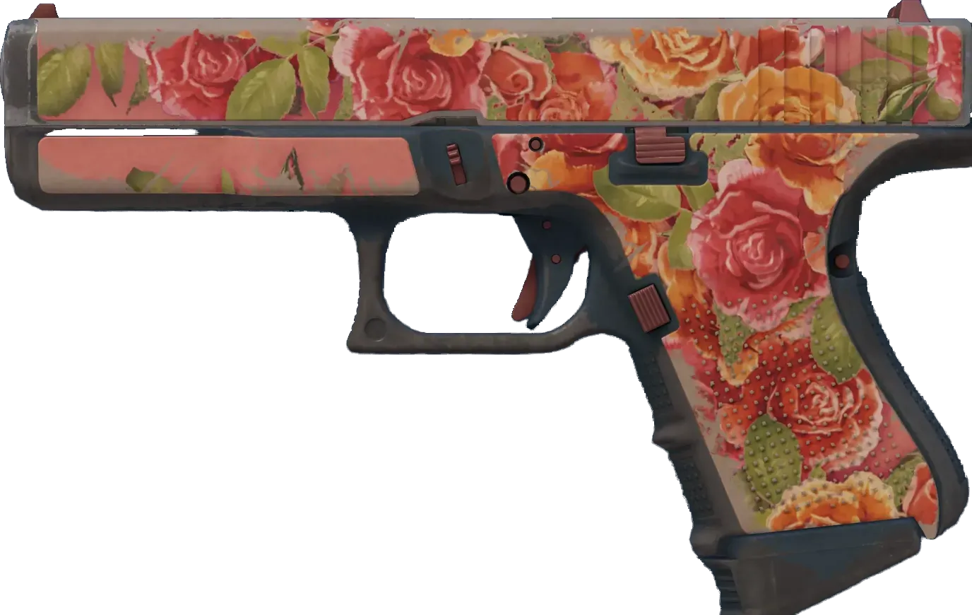 The Glock 18 is a serviceable first-round pistol that works best against unarmored opponents and is capable of firing three-round bursts. A vintage pattern of roses over a coral pink base has been applied. _LOL (lots of love), Grandma_