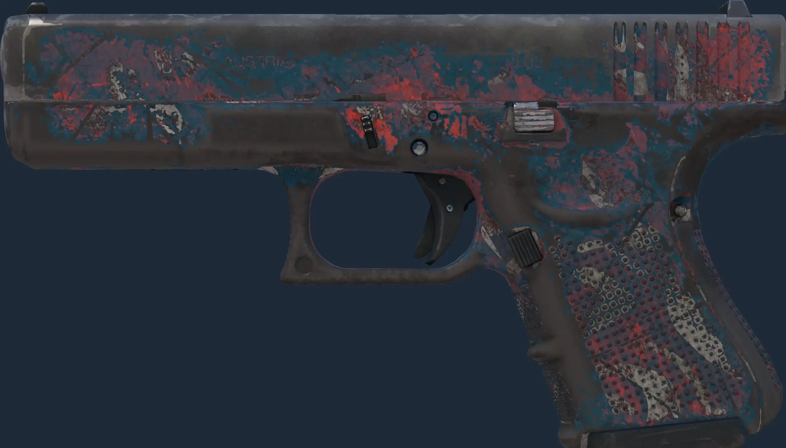 The Glock-18 | Teal Graf is a Covert grade skin for the Glock-18 in Counter-Strike 2. It features a Custom Paint Job finish and was designed by Valve.