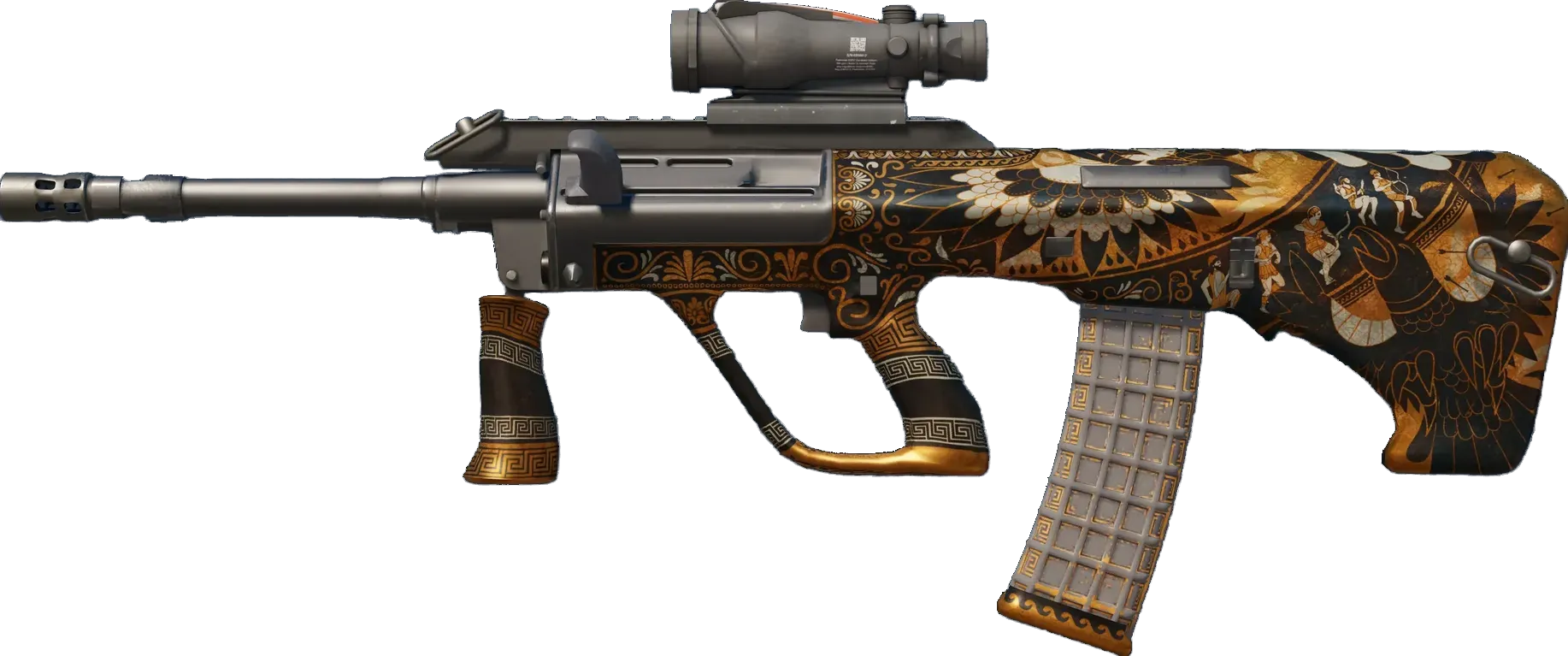 Powerful and accurate, the AUG scoped assault rifle compensates for its long reload times with low spread and a high rate of fire. It has been custom painted to depict stymphalian birds from Greek mythology. _Artemis sends her regards_