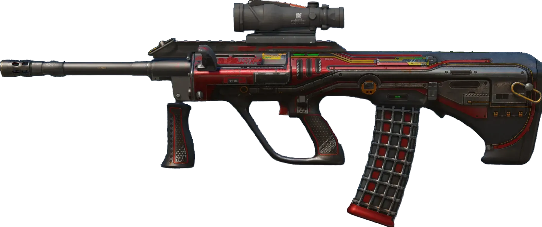 Powerful and accurate, the AUG scoped assault rifle compensates for its long reload times with low spread and a high rate of fire. It has been custom designed by renowned artist Syd Mead. _In the past he gave us visions of the future; in the present he placed the future in our hands..._