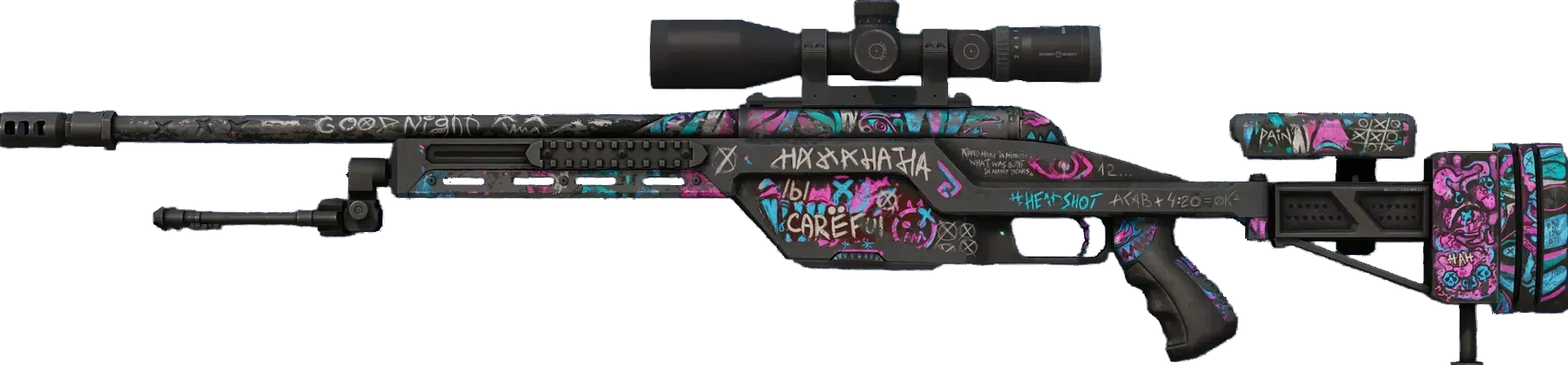 The SSG08 bolt-action is a low-damage but very cost-effective sniper rifle, making it a smart choice for early-round long-range marksmanship. It has been custom painted with manic pink, blue, and purple drawings on a black base. _H@@HH@H@H@HA!!_