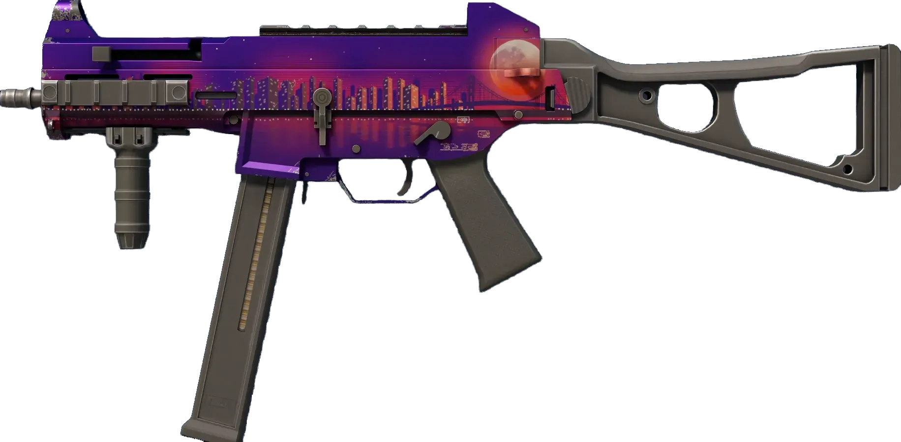 The misunderstood middle child of the SMG family, the UMP45's small magazine is the only drawback to an otherwise versatile close-quarters automatic. A randomized city landscape in the foreground gives way to a full moon and purple-red night sky. _Look for the North Star_