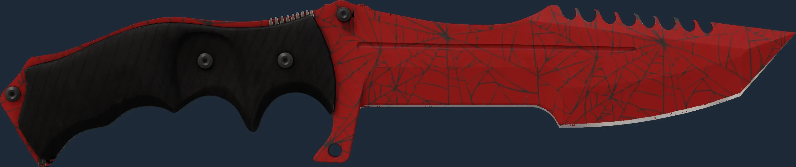 This Huntsman Knife has been painted in a "Hydrographic" style, with the Crimson Web finish. Disassembled weapon parts are lowered through a floating hydrographic film on the surface of a water tank. The film adheres to the primed weapon parts, covering the surface with a pattern. The primary color of this skin is composed of a red tint. The look of the Crimson Web finish is affected by its pattern index. The skin uses the old legacy model.