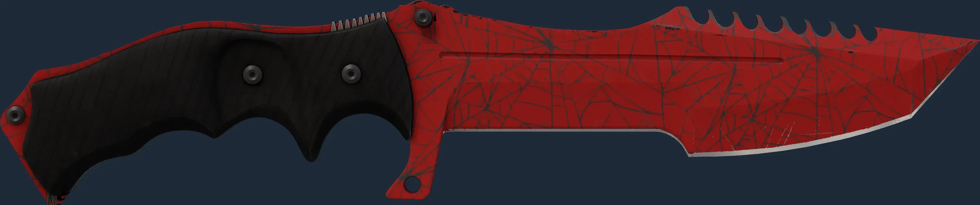 This Huntsman Knife has been painted in a "Hydrographic" style, with the Crimson Web finish. Disassembled weapon parts are lowered through a floating hydrographic film on the surface of a water tank. The film adheres to the primed weapon parts, covering the surface with a pattern. The primary color of this skin is composed of a red tint. The look of the Crimson Web finish is affected by its pattern index. The skin uses the old legacy model.