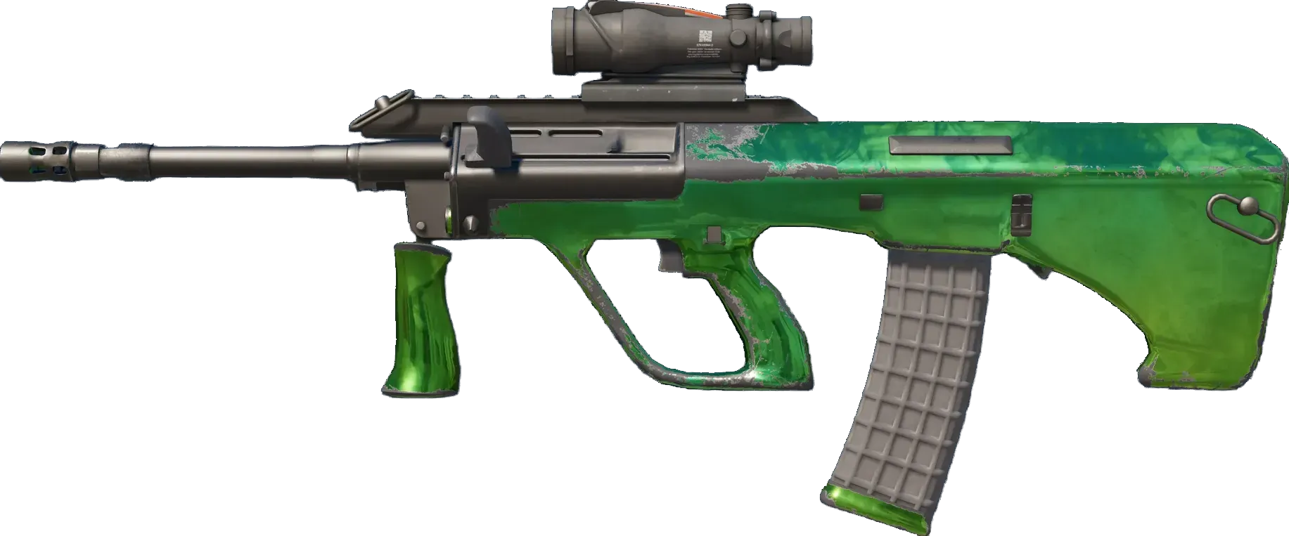 Powerful and accurate, the AUG scoped assault rifle compensates for its long reload times with low spread and a high rate of fire. It has been painted with a chrome base coat and candied in transparent jade-green anodized effect paint. _The finest of the finer things_