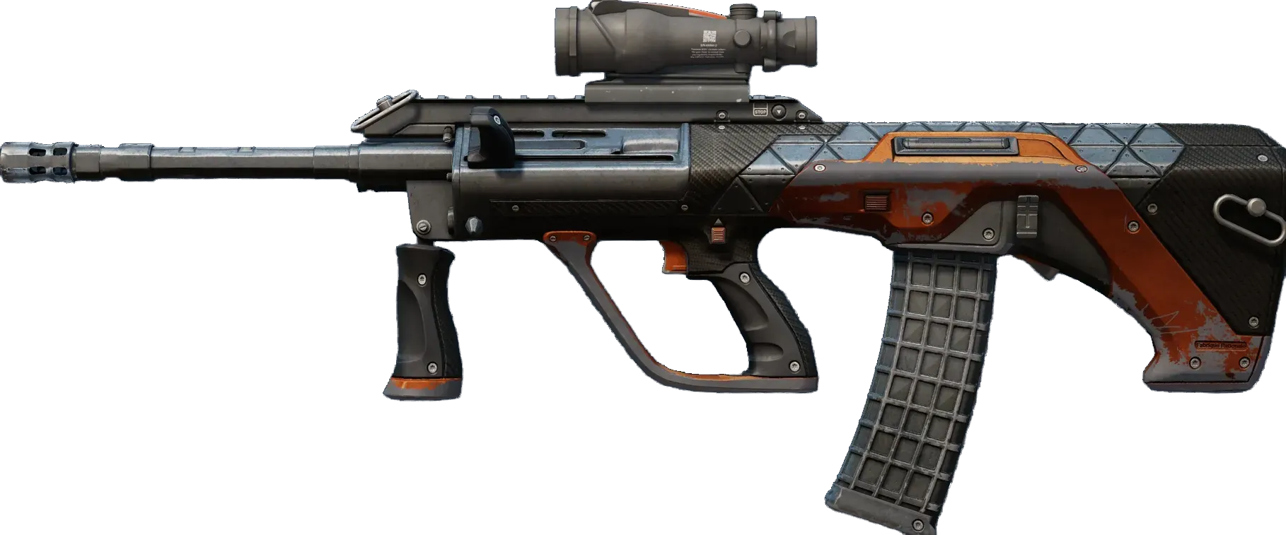 Powerful and accurate, the AUG scoped assault rifle compensates for its long reload times with low spread and a high rate of fire. A custom paint job with gunmetal triangles and carbon fiber over a burnt orange base. _All things being equal_
