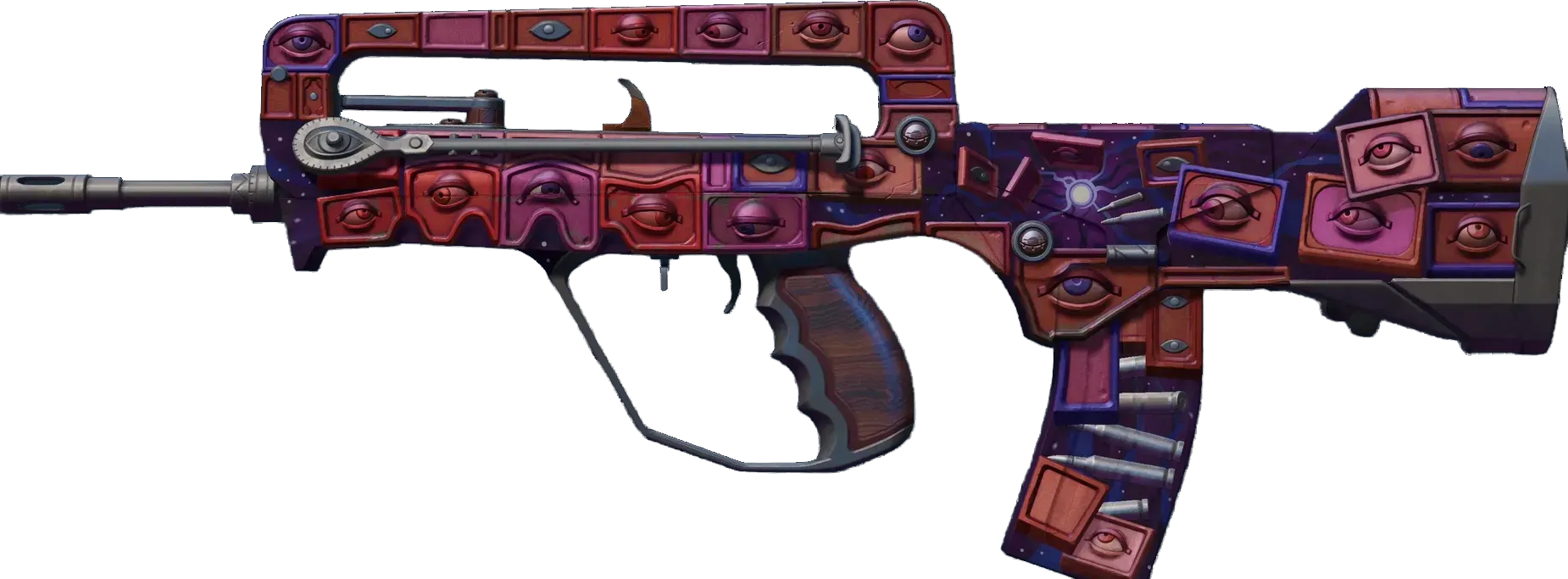 A cheap option for cash-strapped players, the FAMAS effectively fills the niche between more expensive rifles and the less-effective SMGs. It has been custom painted with pink interlocking squares. The squares are painted with lifelike eyes. _Frantic are the eyes of the dreamer_