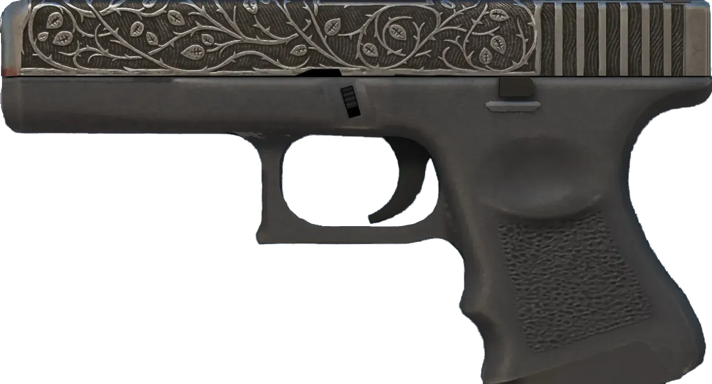 The Glock 18 is a serviceable first-round pistol that works best against unarmored opponents and is capable of firing three-round bursts. The slide has been laser etched to depict ivy and thorns. _Left unchecked, any garden becomes a tangled mass of weeds_