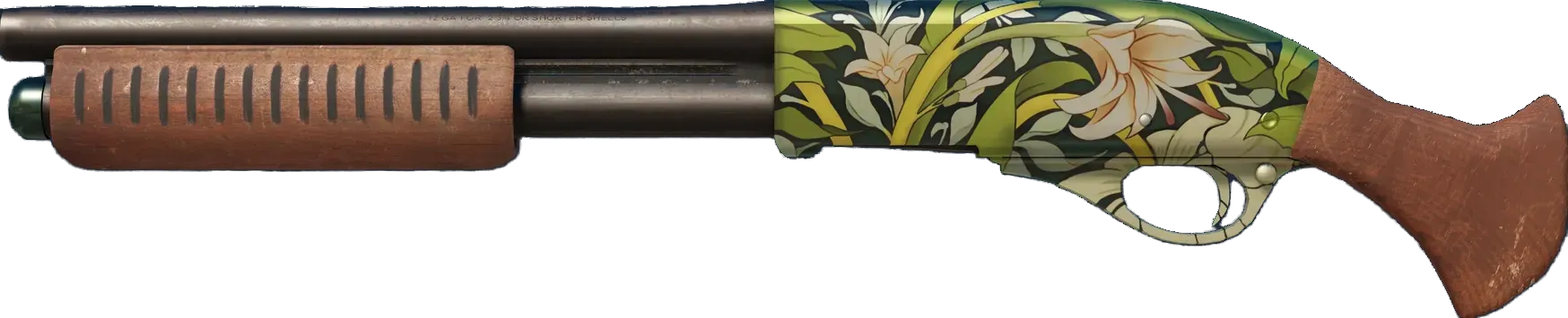The classic Sawed-Off deals very heavy close-range damage, but with its low accuracy, high spread and slow rate of fire, you'd better kill what you hit. It has been hand painted with ornate flowers using a pale color palette. _Close quarters nouveau_
