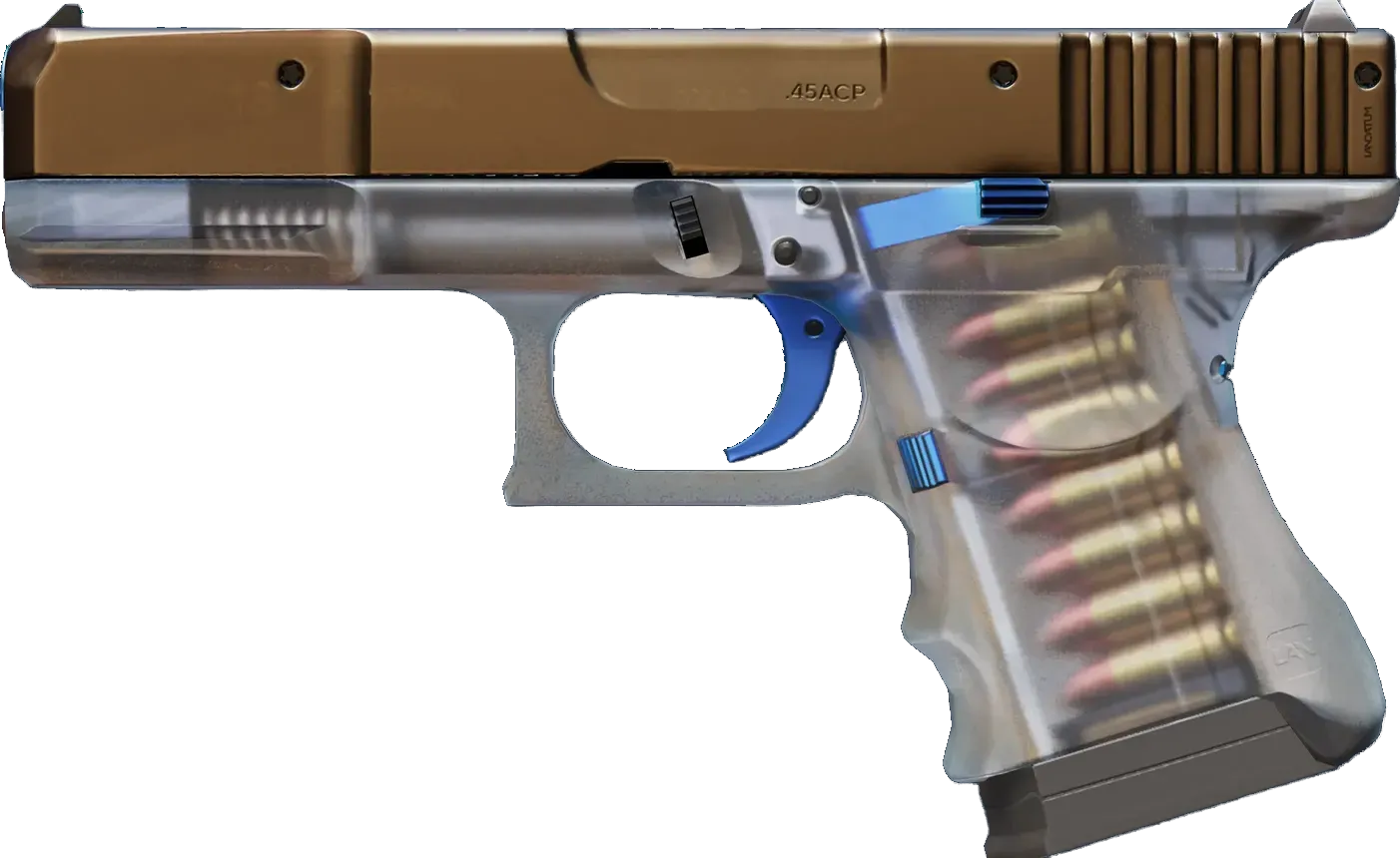 The Glock 18 is a serviceable first-round pistol that works best against unarmored opponents and is capable of firing three-round bursts. It has been painted with a tan slide and blue trigger. The frame is made of a clear polymer. _What you see is what you get_