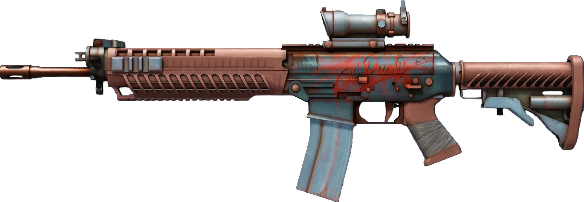 The terrorist-exclusive SG553 is a premium scoped alternative to the AK47 for effective long-range engagement. Originally polished steel, moisture has changed this weapon's appearance. "Ol' Rusty" has been stamped above the trigger casing. _A rusty, trusty friend_