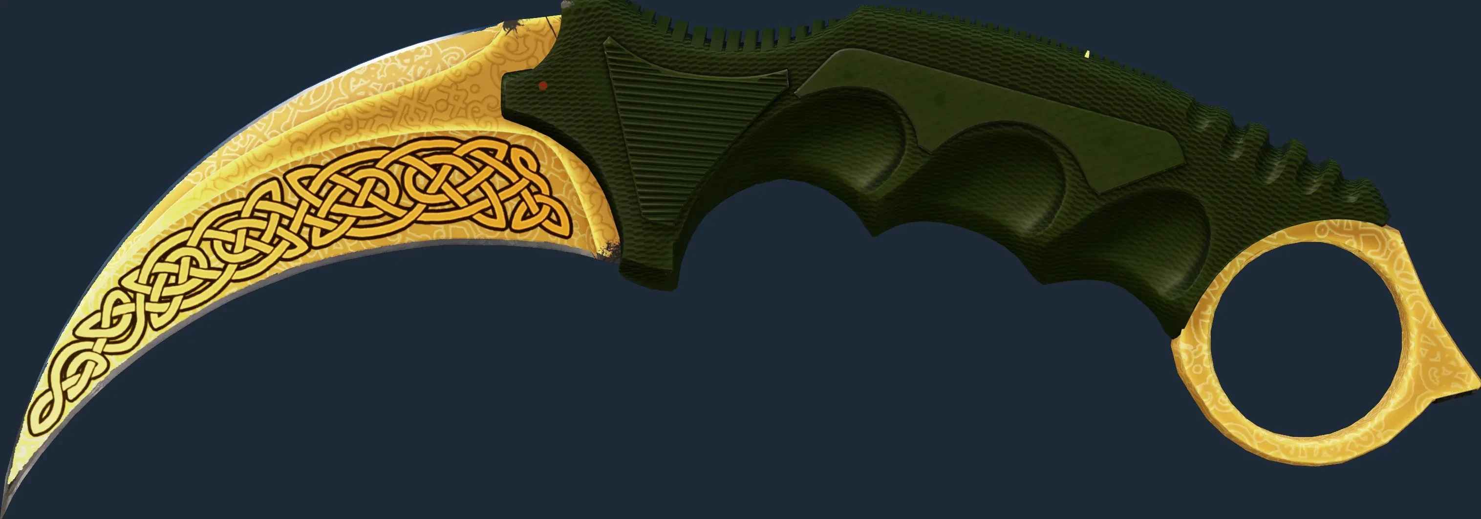 This Karambit has been painted in a "Custom Paint Job" style, with the Lore finish. This style enables extremely customized looks in a full range of colors. The skin has been painted in a color scheme of yellow and gold. Different pattern indexes have no effect on the Lore finish. The skin uses the old legacy model.