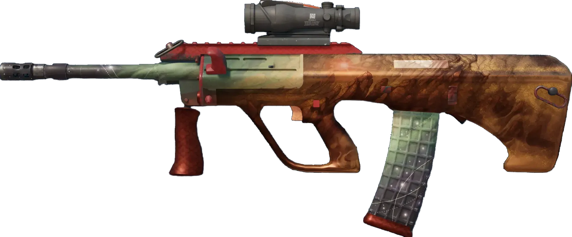 Powerful and accurate, the AUG scoped assault rifle compensates for its long reload times with low spread and a high rate of fire. A custom paint job depicting a passing sand storm underneath the night sky has been applied. _There is beauty all around us, you just have to know where to look_