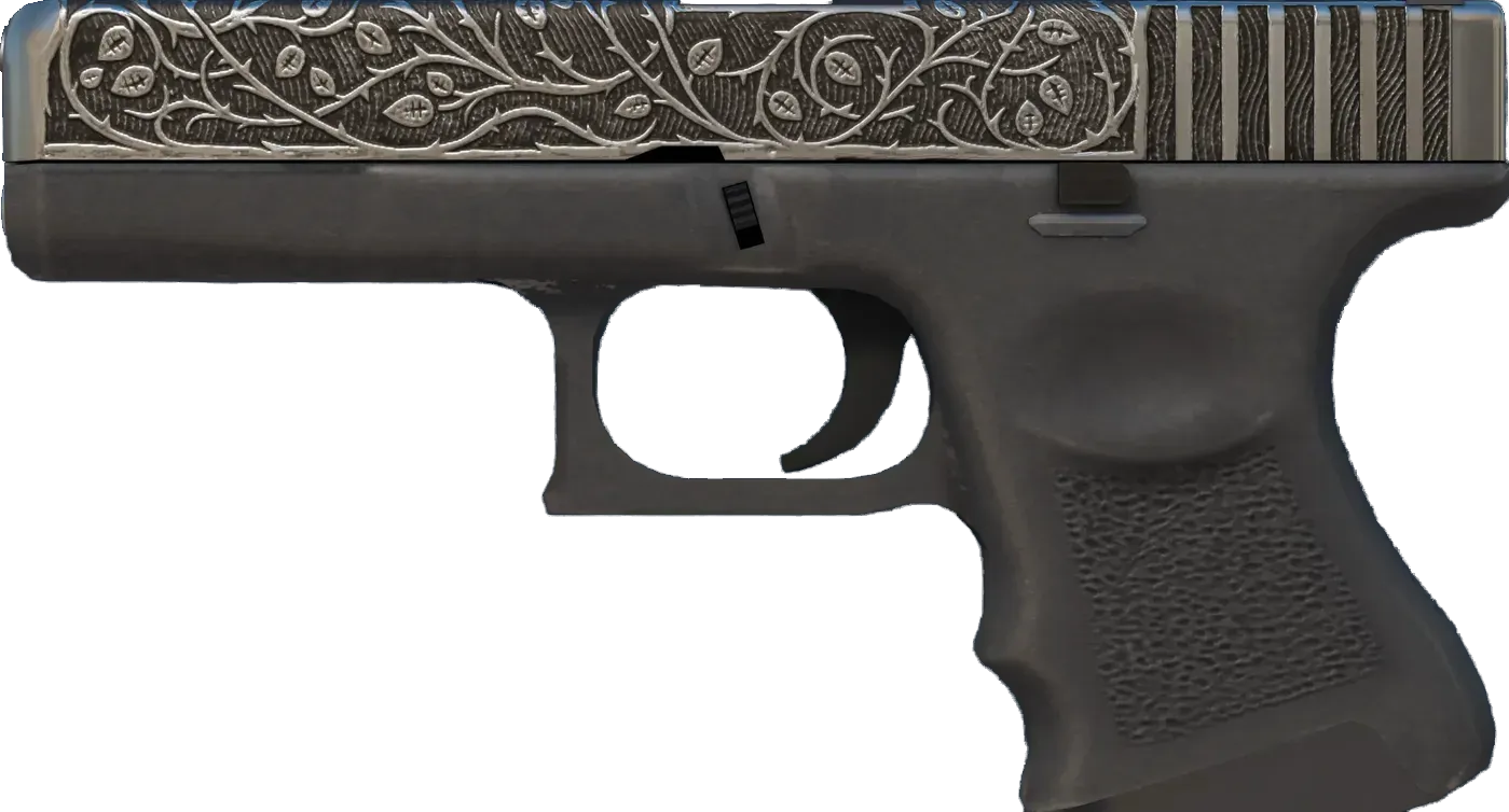 The Glock 18 is a serviceable first-round pistol that works best against unarmored opponents and is capable of firing three-round bursts. The slide has been laser etched to depict ivy and thorns. _Left unchecked, any garden becomes a tangled mass of weeds_