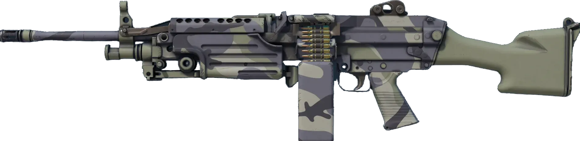 A strong open-area LMG, the M249 is the perfect choice for players willing to trade a slow fire rate for increased accuracy and a high ammo capacity. A green and grey hydrographic pattern has been applied. _"We weren't sure if we were the ambushers... or the ambushees"_