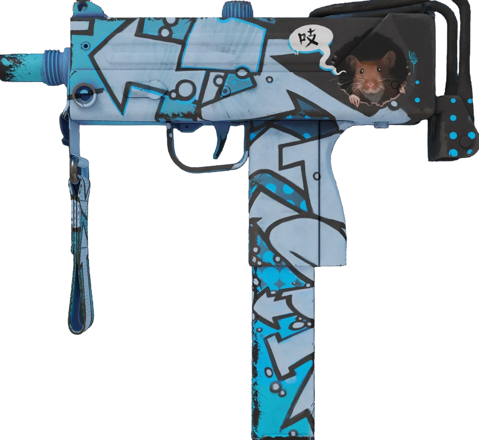 Essentially a box that bullets come out of, the MAC-10 SMG boasts a high rate of fire, with poor spread accuracy and high recoil as trade-offs. The rat near the rear sight is surrounded by black and blue graffiti. _Game on_