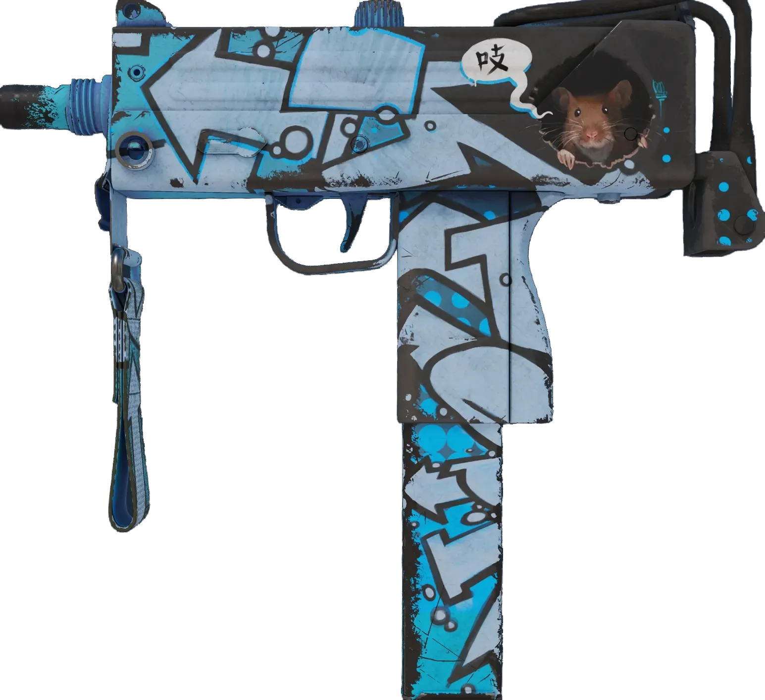 Essentially a box that bullets come out of, the MAC-10 SMG boasts a high rate of fire, with poor spread accuracy and high recoil as trade-offs. The rat near the rear sight is surrounded by black and blue graffiti. _Game on_