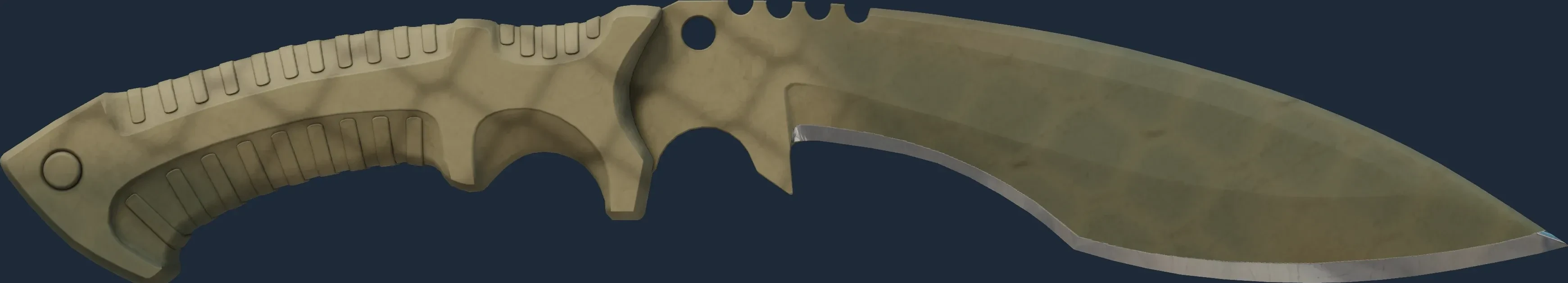 This Kukri Knife has been painted in a "Spray-Paint" style, with the Safari Mesh finish. The weapon is spray-painted with multiple coats through stencil patterns. That said, this particular skin has been mostly painted in shades of gray. The look of the Safari Mesh finish is affected by its pattern index. The skin uses the new CS2 model.