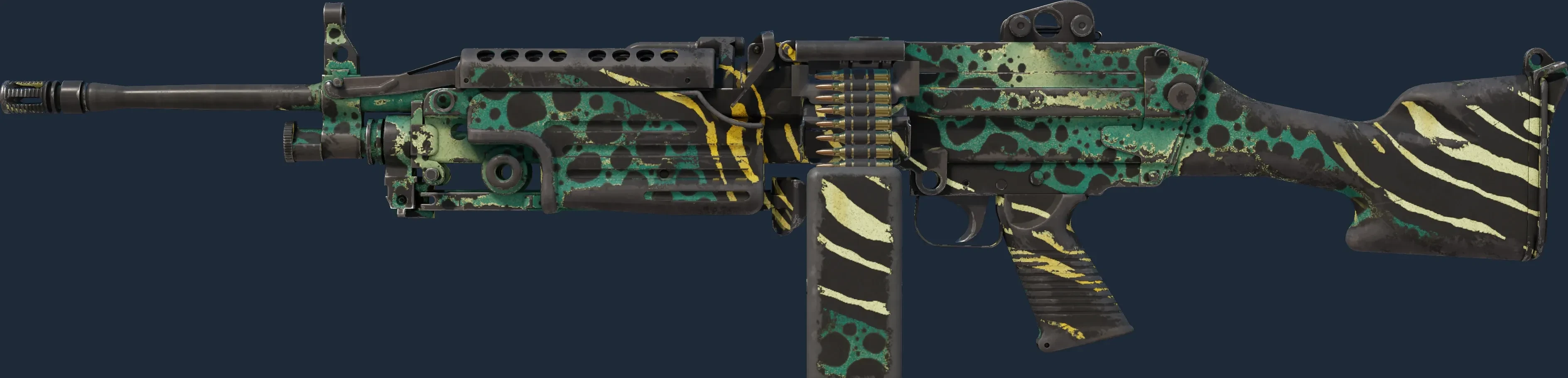 The M249 | Emerald Poison Dart is one of 49 other Machinegun skins. The rarity of the skin is Restricted, which makes the Emerald Poison Dart a rather rare drop with an estimated drop chance of 15.98%.