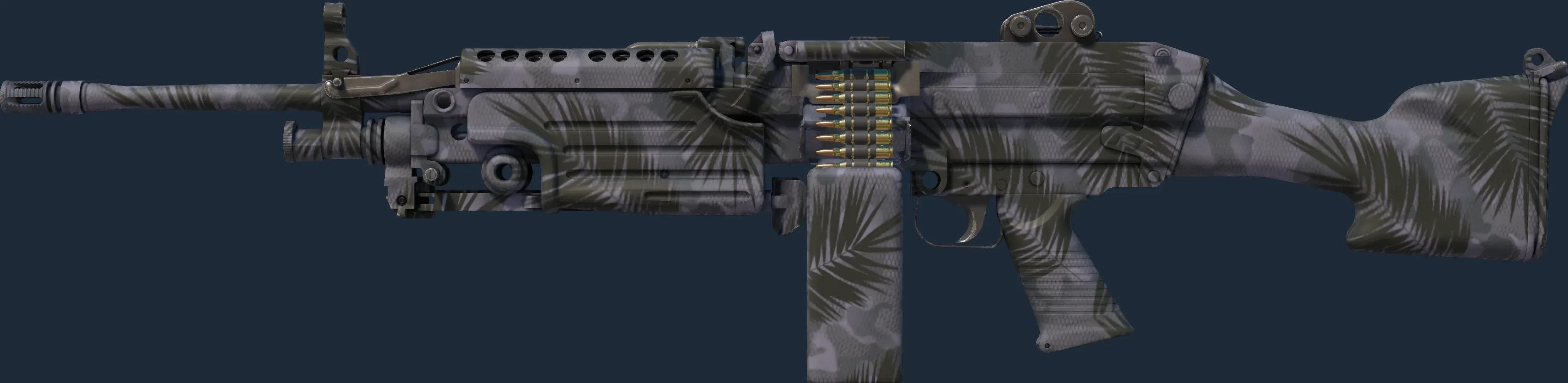 The M249 | Midnight Palm is a Covert grade skin for the M249 in Counter-Strike 2. It features a Custom Paint Job finish and was designed by Valve.