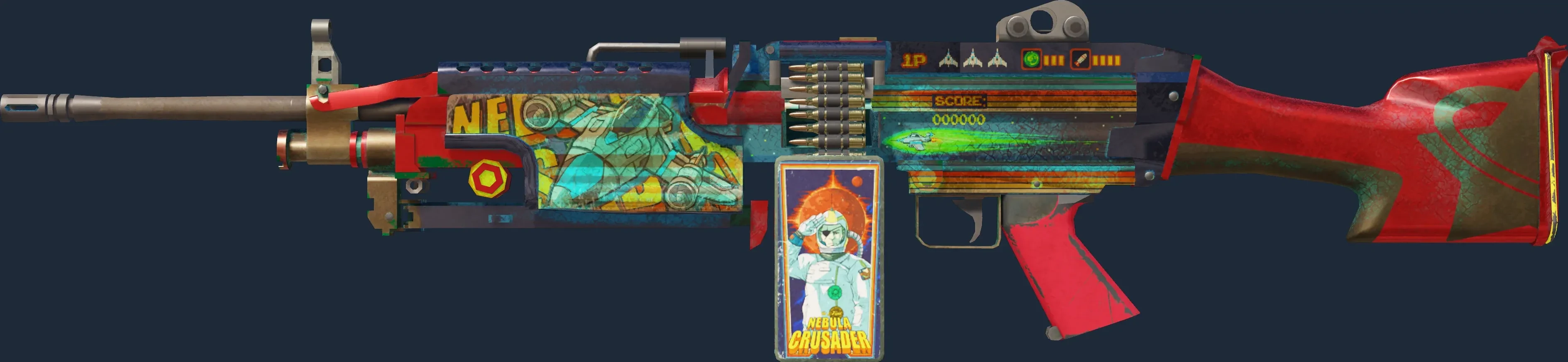 The M249 | Nebula Crusader is a Covert grade skin for the M249 in Counter-Strike 2. It features a Custom Paint Job finish and was designed by Zaphk.