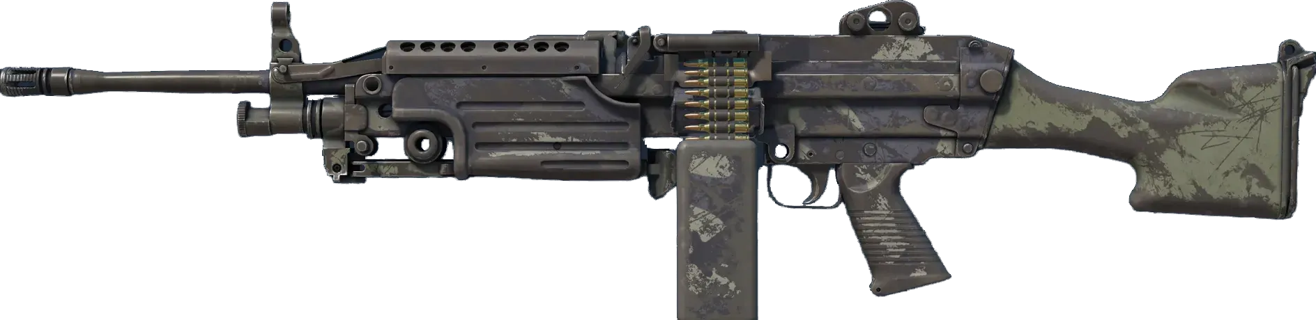 A strong open-area LMG, the M249 is the perfect choice for players willing to trade a slow fire rate for increased accuracy and a high ammo capacity. A green and grey hydrographic pattern has been applied. _"We weren't sure if we were the ambushers... or the ambushees"_