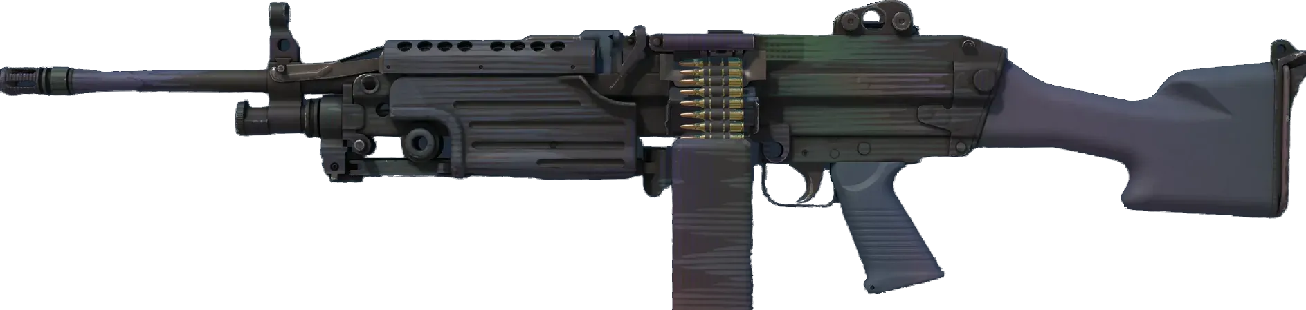A strong open-area LMG, the M249 is the perfect choice for players willing to trade a slow fire rate for increased accuracy and a high ammo capacity. It has been custom painted using a green and blue halftone pattern. _This one's off the charts_