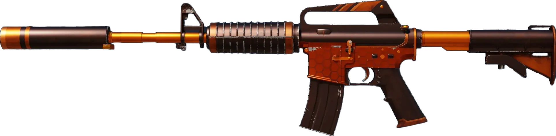 With a smaller magazine than its unmuffled counterpart, the silenced M4A1 provides quieter shots with less recoil and better accuracy. It has been anodized black and orange.