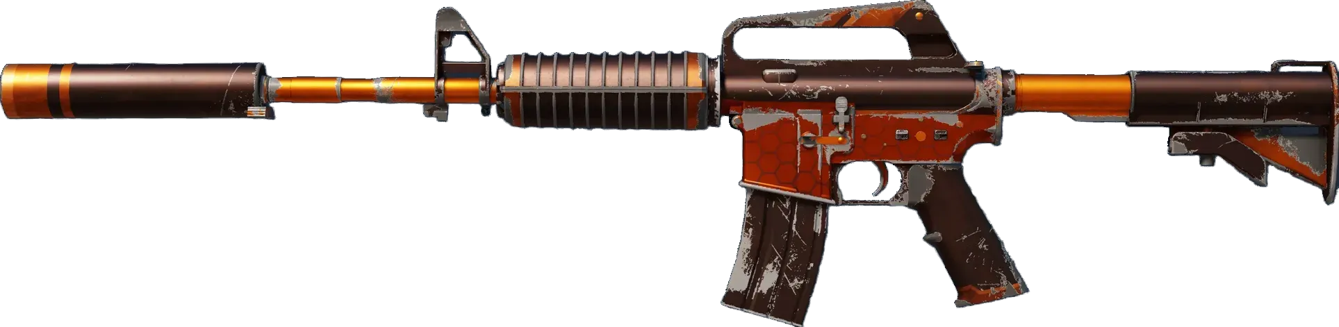 With a smaller magazine than its unmuffled counterpart, the silenced M4A1 provides quieter shots with less recoil and better accuracy. It has been anodized black and orange.