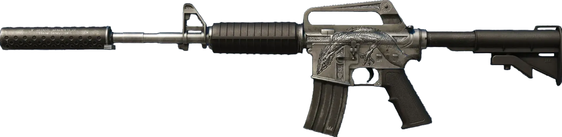 With a smaller magazine than its unmuffled counterpart, the silenced M4A1 provides quieter shots with less recoil and better accuracy. It has been etched with a basilisk. _It's rude to stare, but war isn't the time for pleasantries_