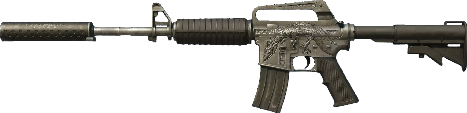 With a smaller magazine than its unmuffled counterpart, the silenced M4A1 provides quieter shots with less recoil and better accuracy. It has been etched with a basilisk. _It's rude to stare, but war isn't the time for pleasantries_