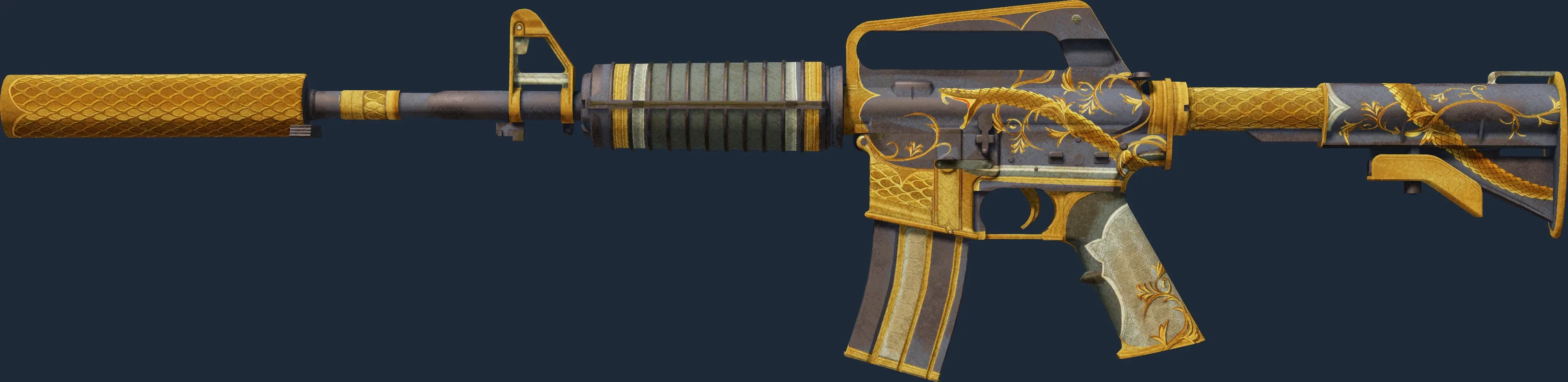 The M4A1-S | Golden Coil is a Covert grade skin for the M4A1-S in Counter-Strike 2. It features a Custom Paint Job finish and was designed by Kitch.sb.