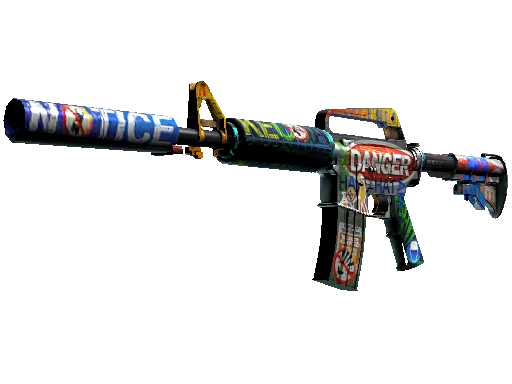 With a smaller magazine than its unmuffled counterpart, the silenced M4A1 provides quieter shots with less recoil and better accuracy. A custom paint job of multicolored safety signs has been applied. _Don't say I didn't warn you… - Booth, Arms Dealer_