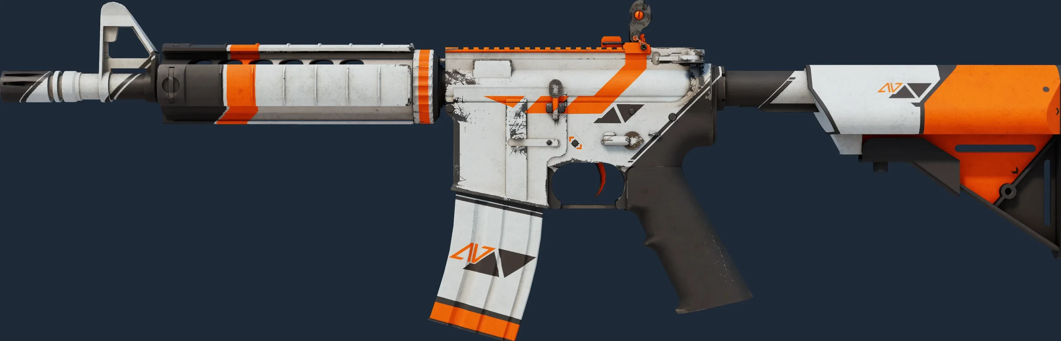 This M4A4 has been painted in a "Custom Paint Job" style, with the Asiimov finish. This style enables extremely customized looks in a full range of colors. The skin has been painted in a color scheme of orange and white. Different pattern indexes have no effect on the Asiimov finish. The skin uses the old legacy model.