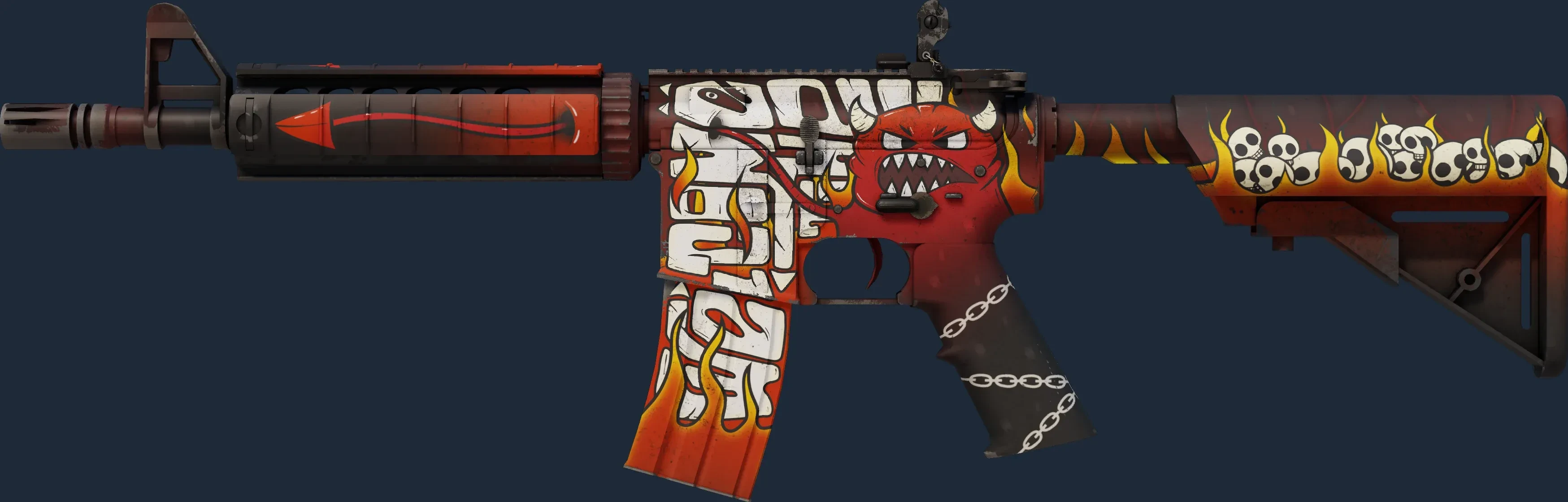 The M4A4 | Hellfire is a Covert grade skin for the M4A4 in Counter-Strike 2. It features a Custom Paint Job finish and was designed by SHPR.