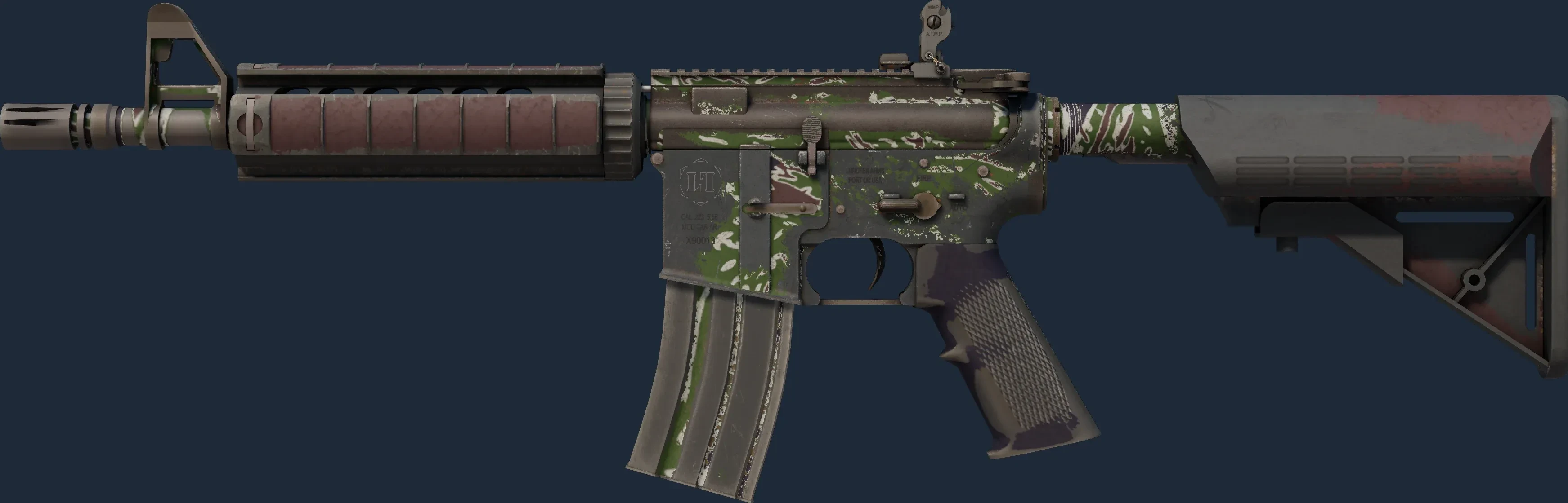 The M4A4 | Jungle Tiger is a Covert grade skin for the M4A4 in Counter-Strike 2. It features a Custom Paint Job finish and was designed by Valve.