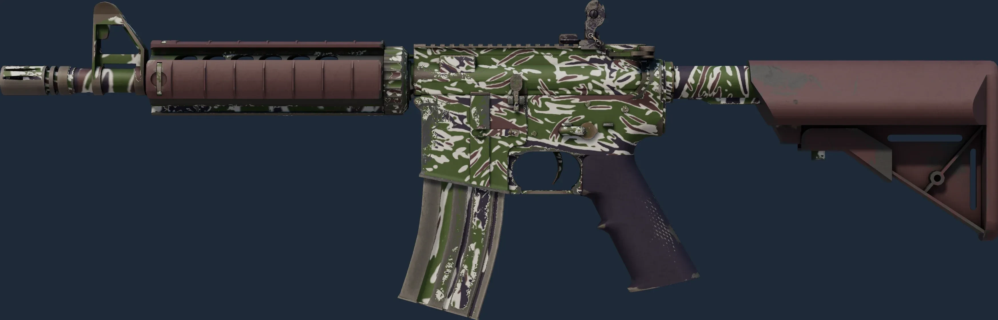 The M4A4 | Jungle Tiger is a Covert grade skin for the M4A4 in Counter-Strike 2. It features a Custom Paint Job finish and was designed by Valve.