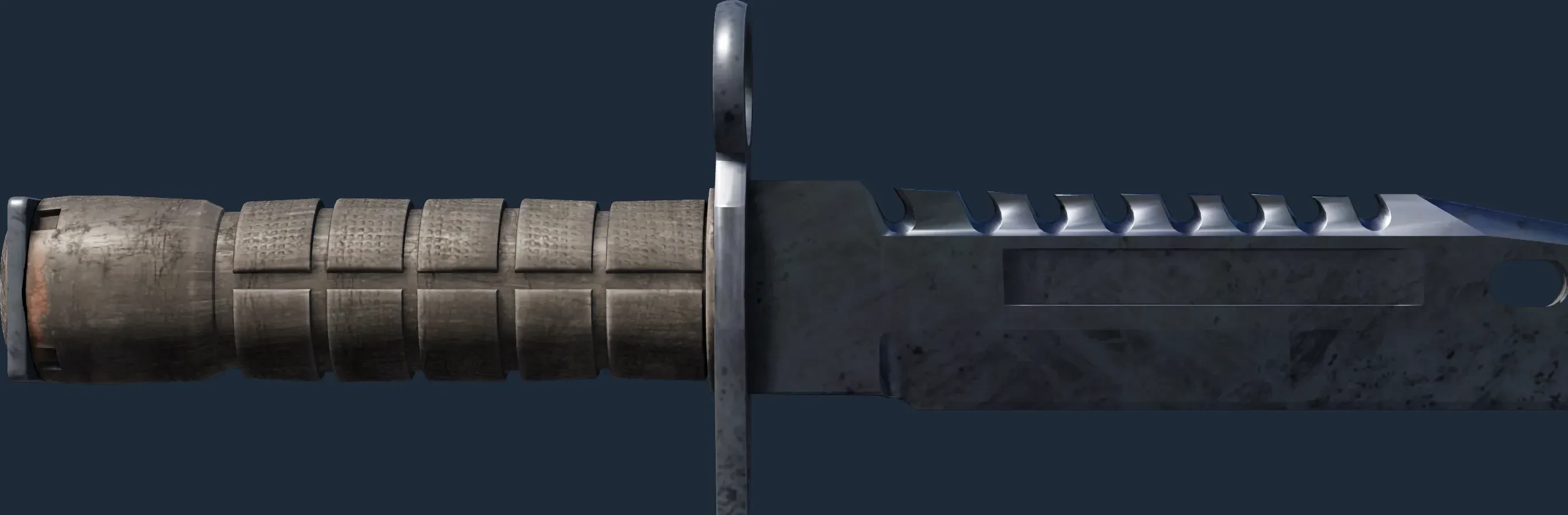 This M9 Bayonet has been painted in a "Patina" style, with the Blue Steel finish. A patina is a chemical reaction that forms a non-reactive, hardened shell over metallic parts. Real-life weapon patinas include case hardening, cold bluing, and acid forced patinas. That said, this particular skin has been mostly painted in shades of gray. The look of the Blue Steel finish is affected by its pattern index. The skin uses the old legacy model.